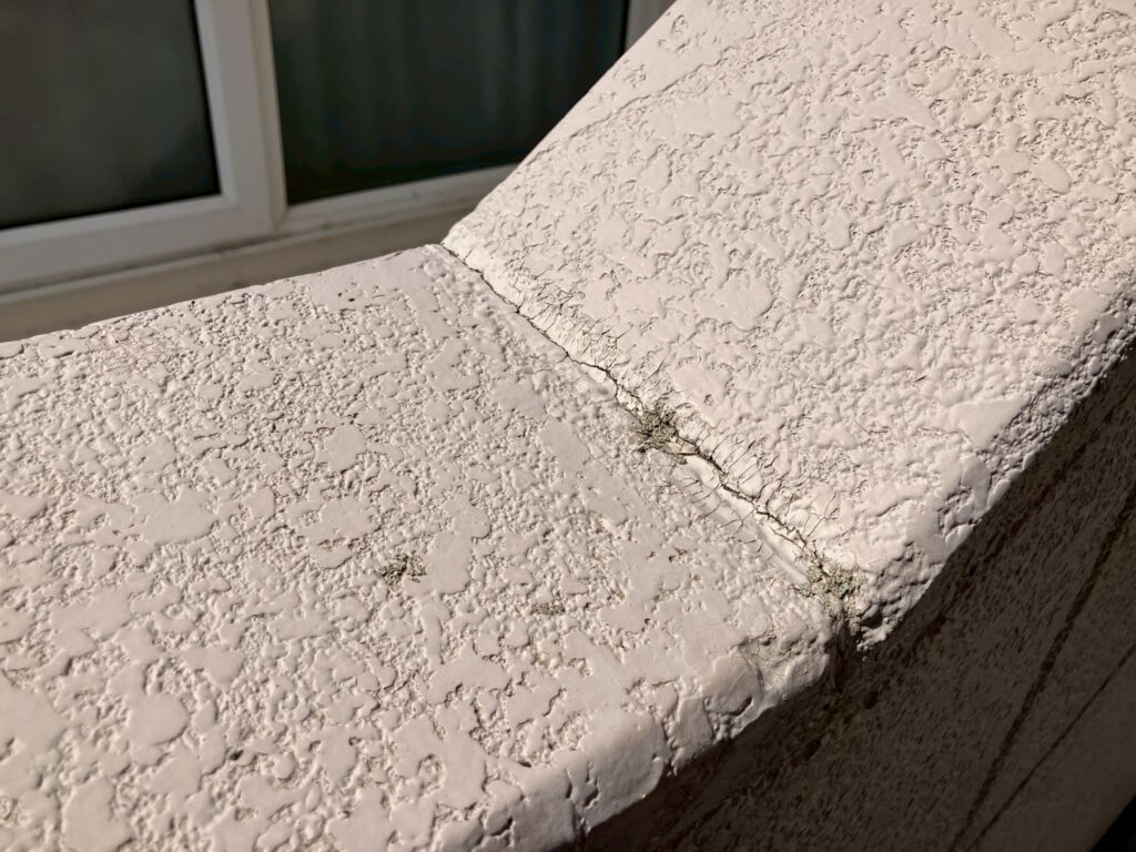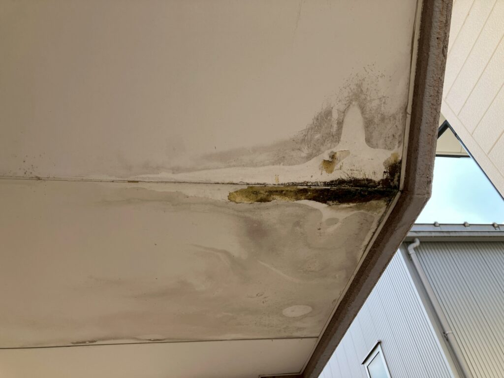 「共用廊下の天井にシミが広がってきた」とのご相談をいただき、現地調査を行ったところ、外壁目地のシーリング材が劣化しており、そこから雨水が浸入していることが判明しました。