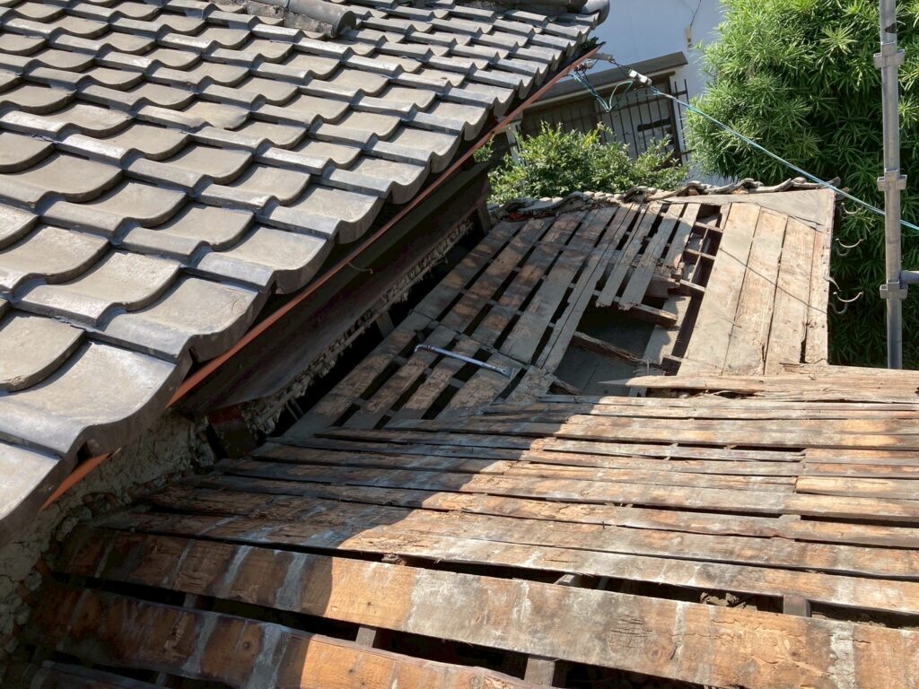 - 被害箇所(屋根片面)の既存瓦をすべて撤去