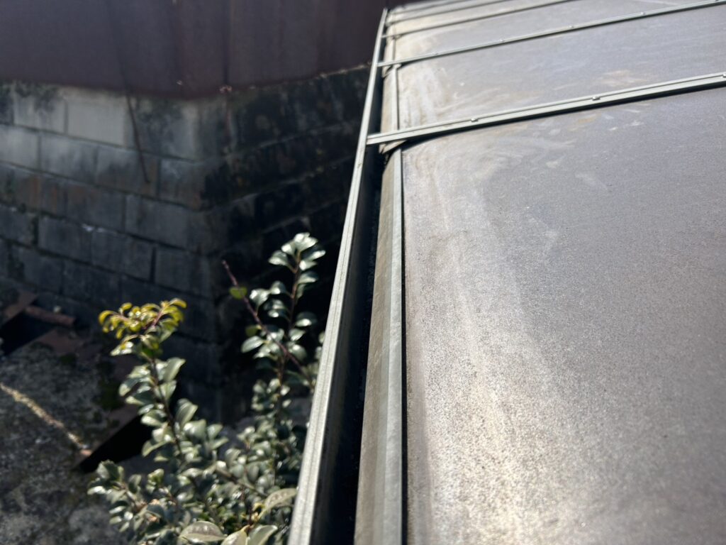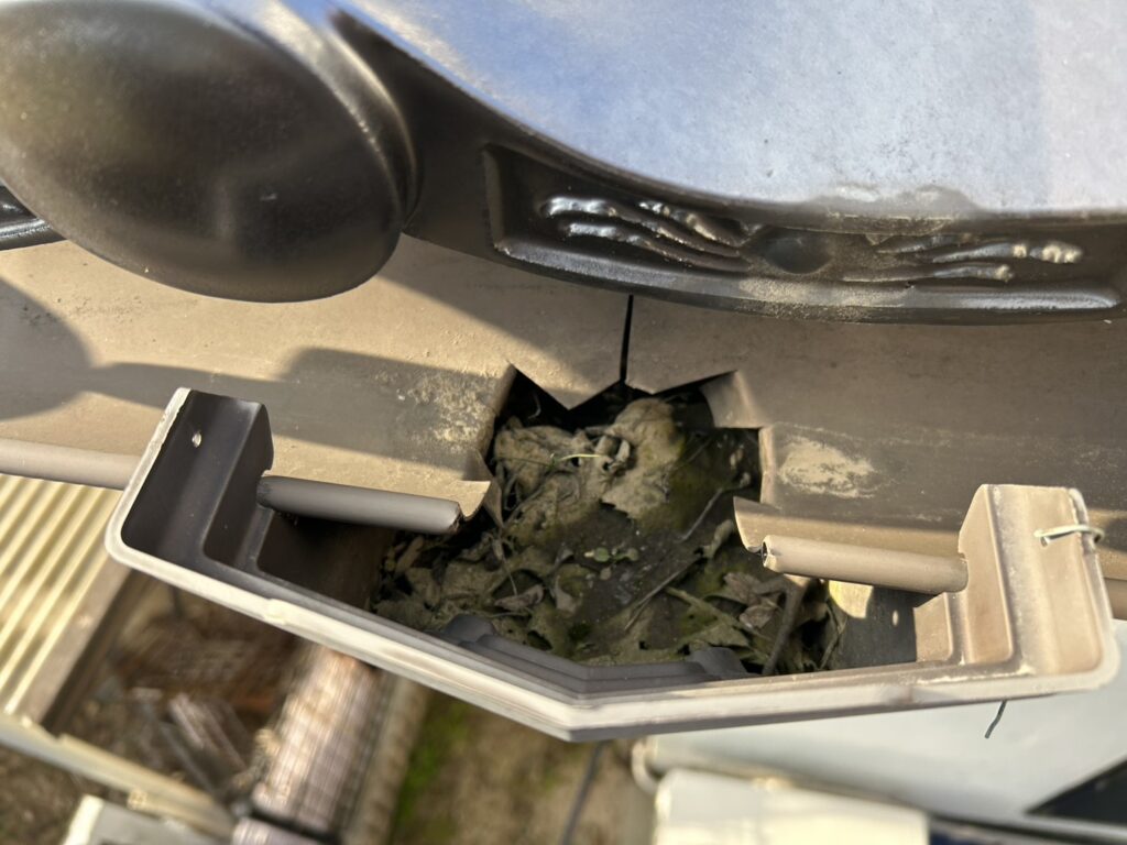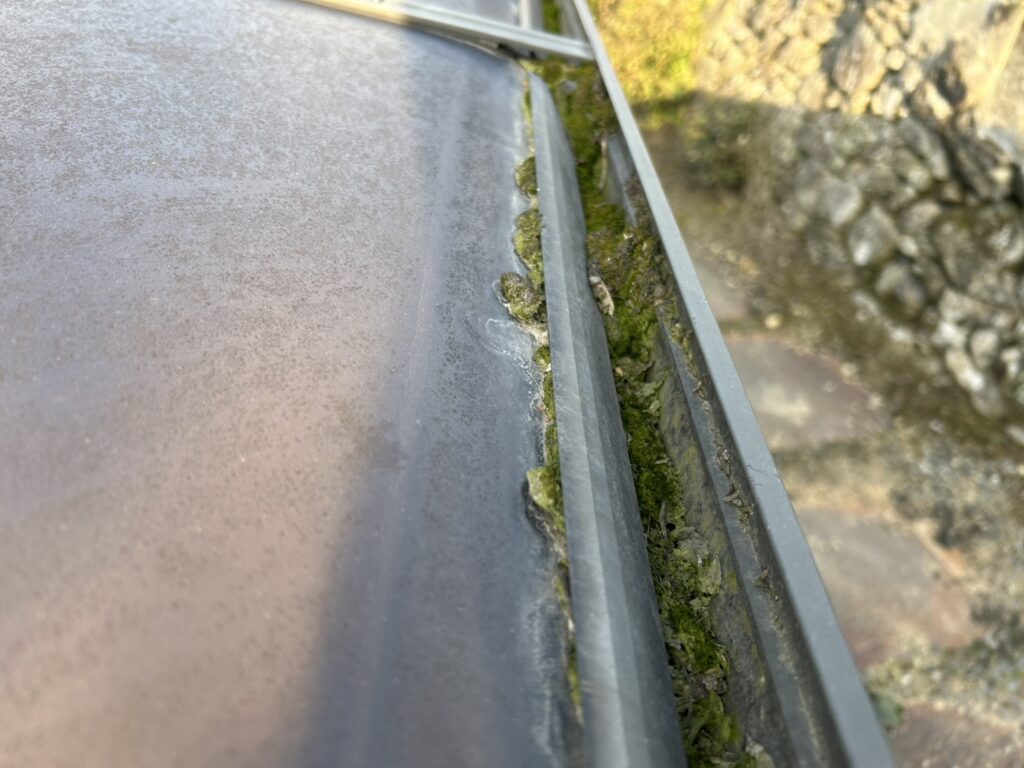 現地調査を行ったところ、雨樋内部に落ち葉や汚れが蓄積しており、一部にズレや劣化も確認されたため、清掃と補修工事を実施しました。